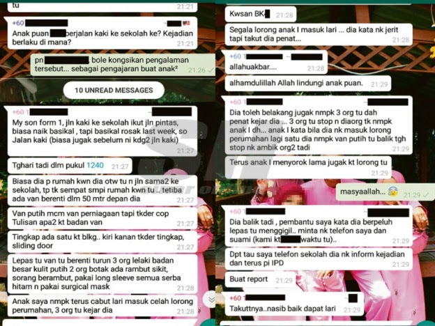 Apabila dia menoleh ke belakang, tiga lelaki itu tadi kelihatan penat setelah cuba mengejarnya. Akhirnya mereka berhenti bila gagal mencari anak saya. Anak saya kata, bila dia nak masuk ke lorong perumahan lagi satu, dia ternampak van putih itu pergi mendapatkan tiga orang lelaki tadi. Anak saya terus menyorok lama juga di lorong itu.