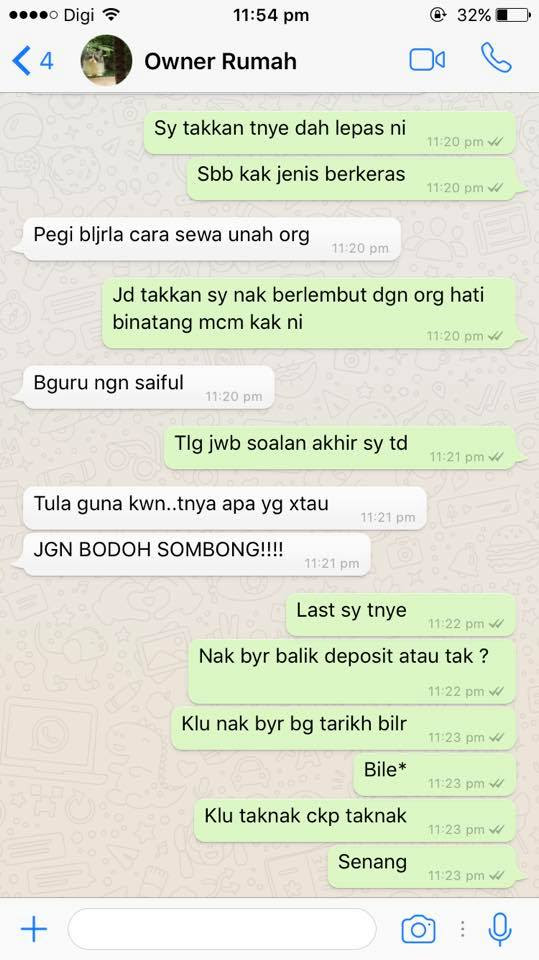 "Janji tiap 5 hb, akak pun nak pakai duit. Patutnya hujung bulan tetapi akak dah tolak ansur 5 hb pun lambat. Kalau dah tak berminat sewa di situ, ada orang nak masuk.